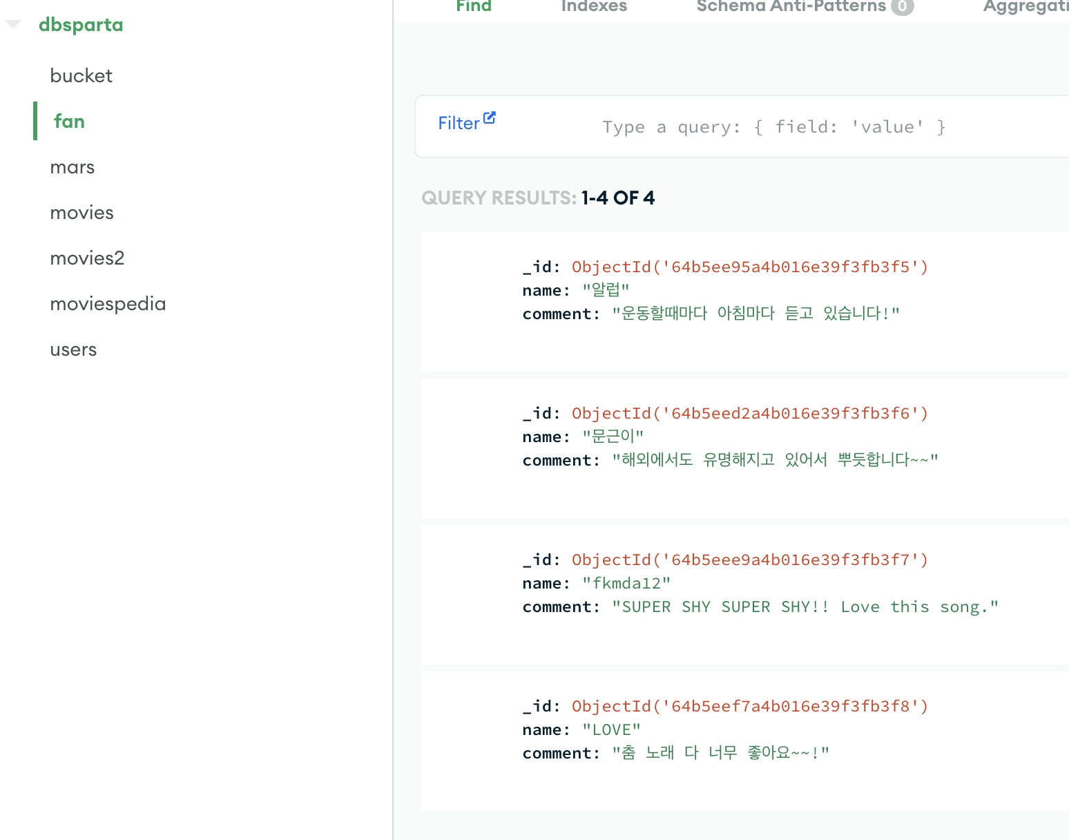 - MongoDB내 fan이라는 collection에 테스트 데이터를 불러와지고(Find) content에 목록으로 나열됨