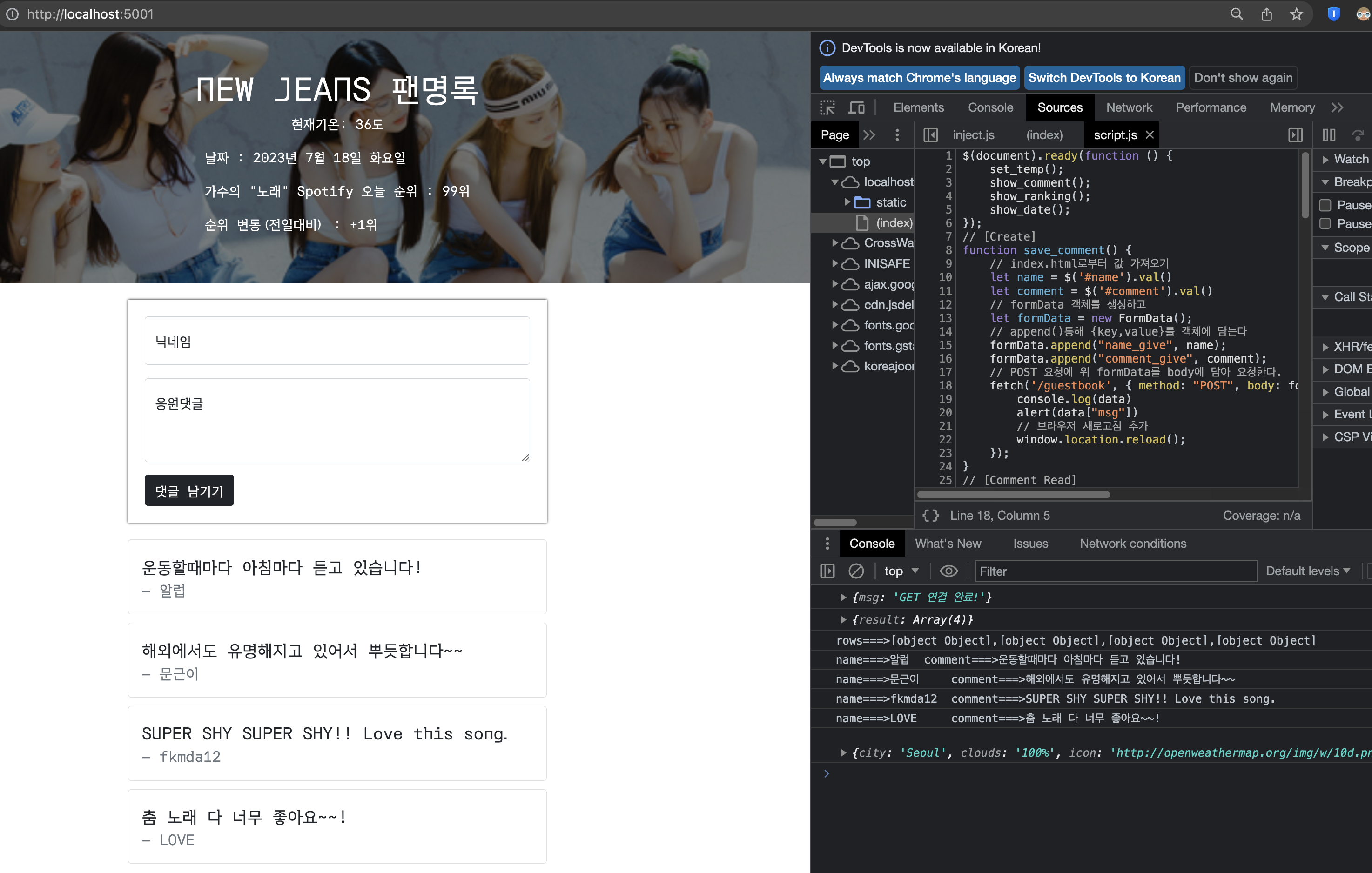 - app.py 마지막에서 all_comment 객체를 jsonify()를 통해서 json 형식으로 변환된 데이터는