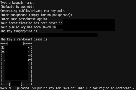 이제 Elastic Beanstalk 패키지를 설치했기 때문에 eb라는 명령어를 사용할 수 있다. 프로젝트 업로드 전 보안 자격증명(사용자 확인 등)을 진행하는데 이는 AWS가입한 사람이 맞는지, 키는 가지고 있는지 등을 검증하는 단계이다. 마치 컴퓨터를 렌털하는데 신분증을 검사하고 보관하는 것과 비슷하다 생각하자.