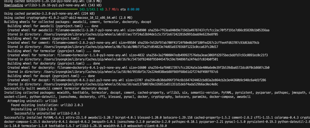 다운로드 및 설치가 완료되면 "Successfully installed PyYAML-5.4.1 attrs-23.1.0 awsebcli-3.20.7 bcrypt-4.0.1... " 메시지가 출력된다.