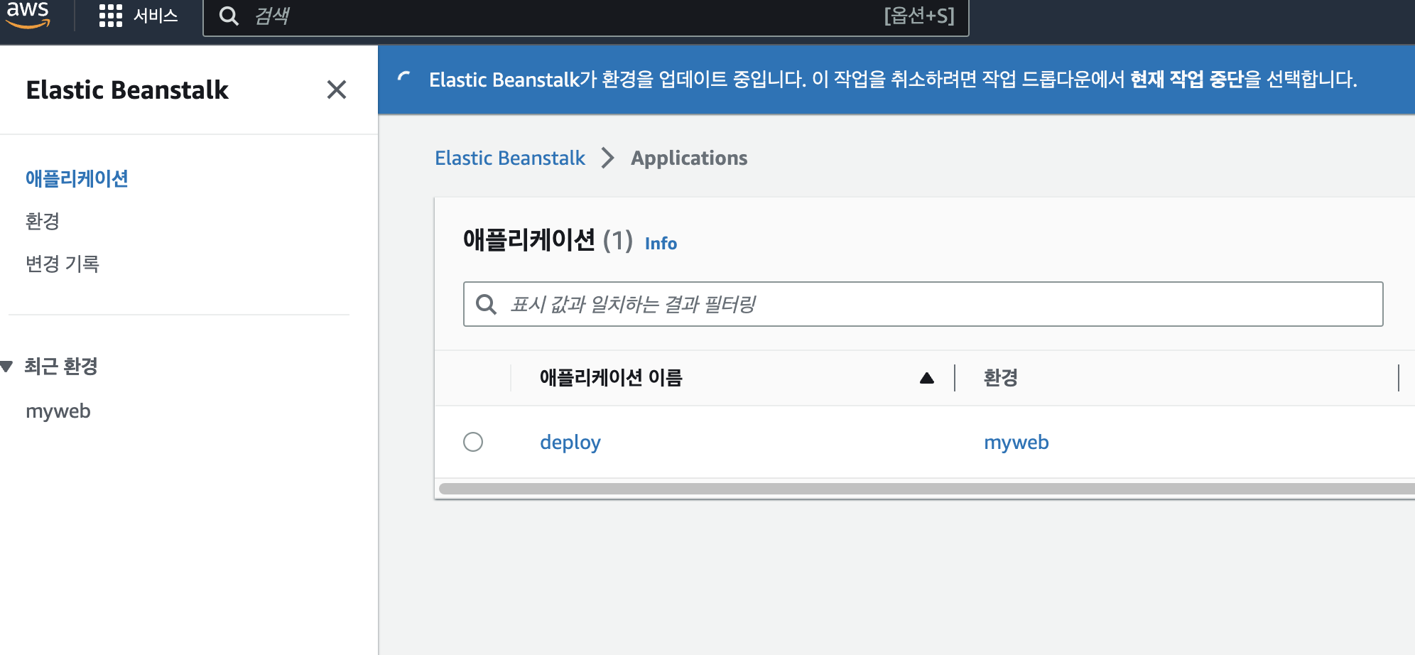 1단계 마지막 부분에서 터미널에서 deploy 폴더로 이동하여 Elastic Beanstalk 패키지 설치를 대기했다. 혹시나 다른 위치라면 "cd deploy"로 커맨드 창에서 해당 폴더에서 대기한다.