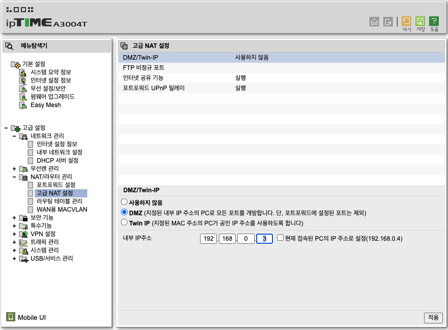 - NAT 설정 - DMZ 설정