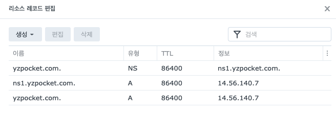 두번째 A유형인은 위 "ns1.yzpocket"이 NAS의 DNS와 연결된다.