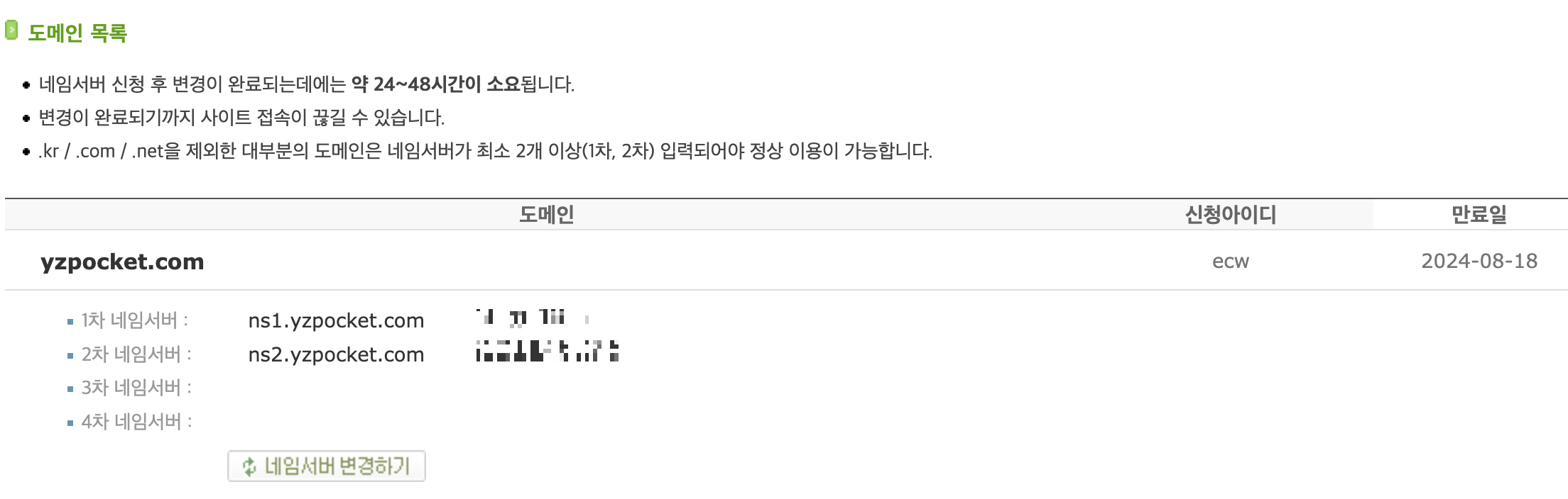도메인 구매 사이트에서 설정 했던 ns1.yzpocket 처럼 나타나지 않는다. 디폴트값으로 잘못 저장되는 경우가 많다.