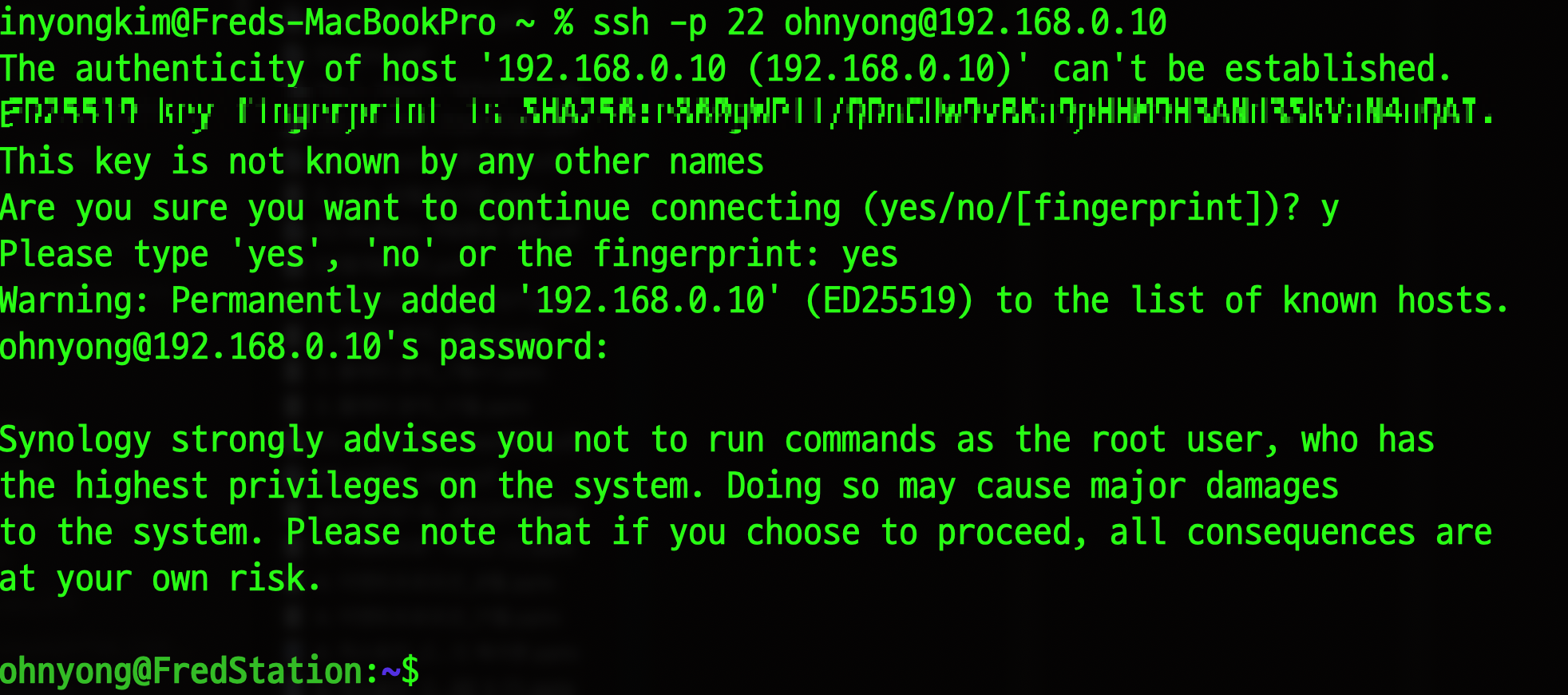 ssh -p <NAS SSH Port No> <user>@192.168.0.<inner IP>