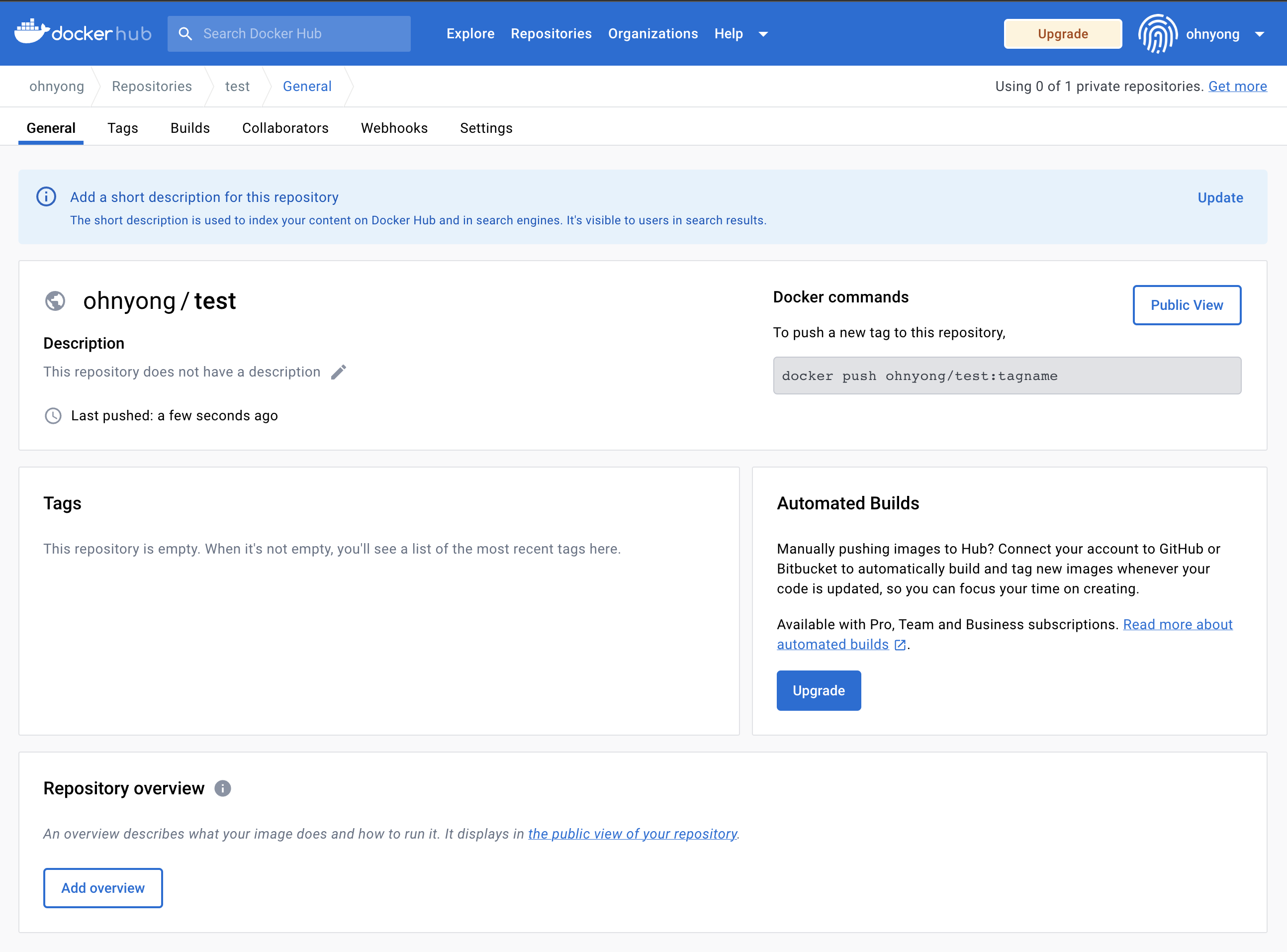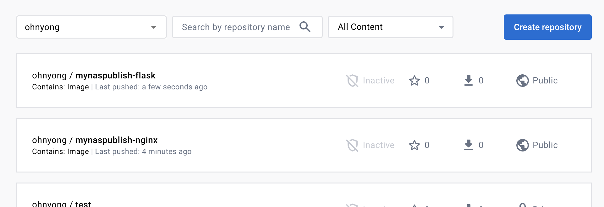 이로써 내가 원하던 형태로 이미지가 생성 됬으며, Docker hub에도 해당 이름의 repository가 자동 생성되고 image가 푸시되었다.
