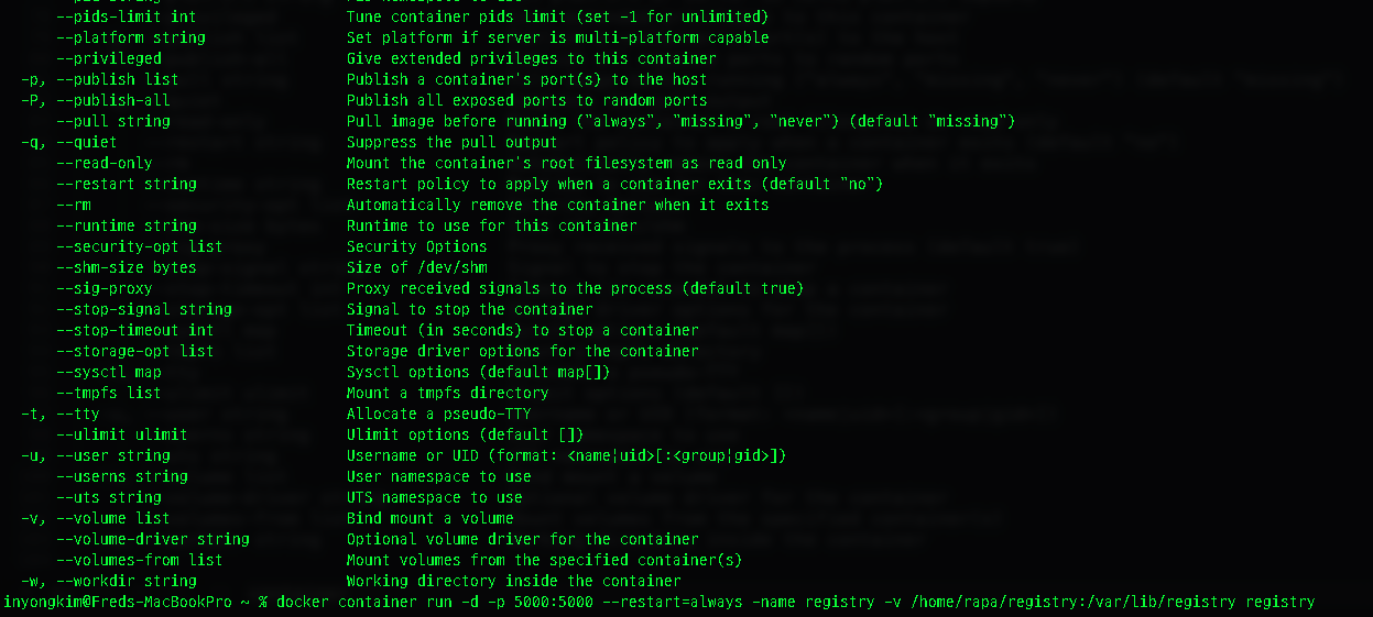 뭔가 커맨드가 변경되었나? docker container run --help로 옵션들을 살펴보았다.