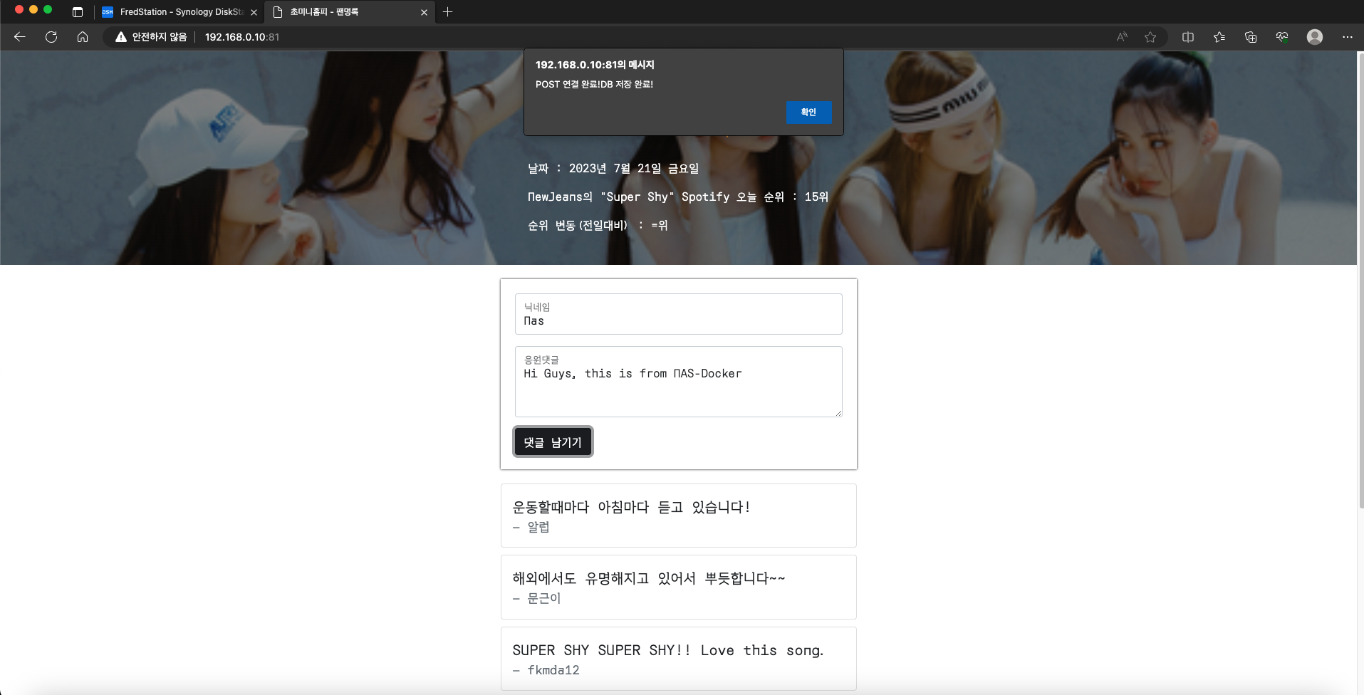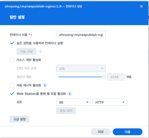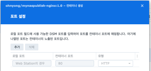 NAS의 Docker는 경량화된 GUI를 가지고 있어서 조금 메뉴가 상이하다. 어쨋든 어떻게든 아래 그림처럼 2개의 이미지가 컨테이너에서 물려서 함께 돌아가면 되고, nginx의 포트는 80:80인것을 기억해두었다.