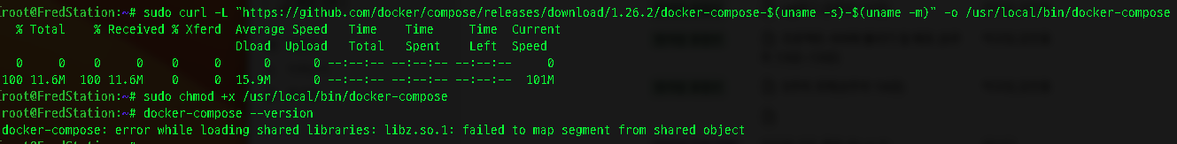 분명히 어제 안되던 것 같았는데 설치가 진행된다. 뭔가 오타가있었는지 잘못된 정보를 봤었는지 기억이 안난다. 아무튼 docker-compose가 설치되었다.