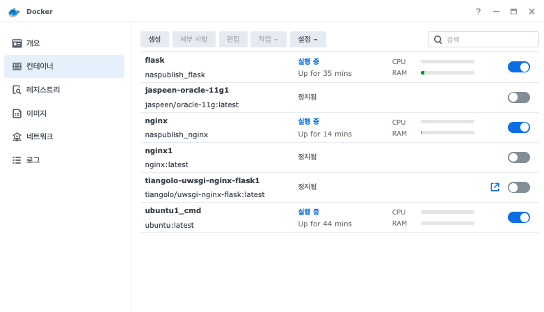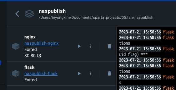 GUI로도 nginx(naspublish_nginx) / flask(naspublish_flask) 컨테이너가 정상적으로 생성되었으며, Local PC의 Docker Desktop과 비교해서 NAS에서는 1개의 컨테이너 묶음으로 표현되지는 않는것 같다.