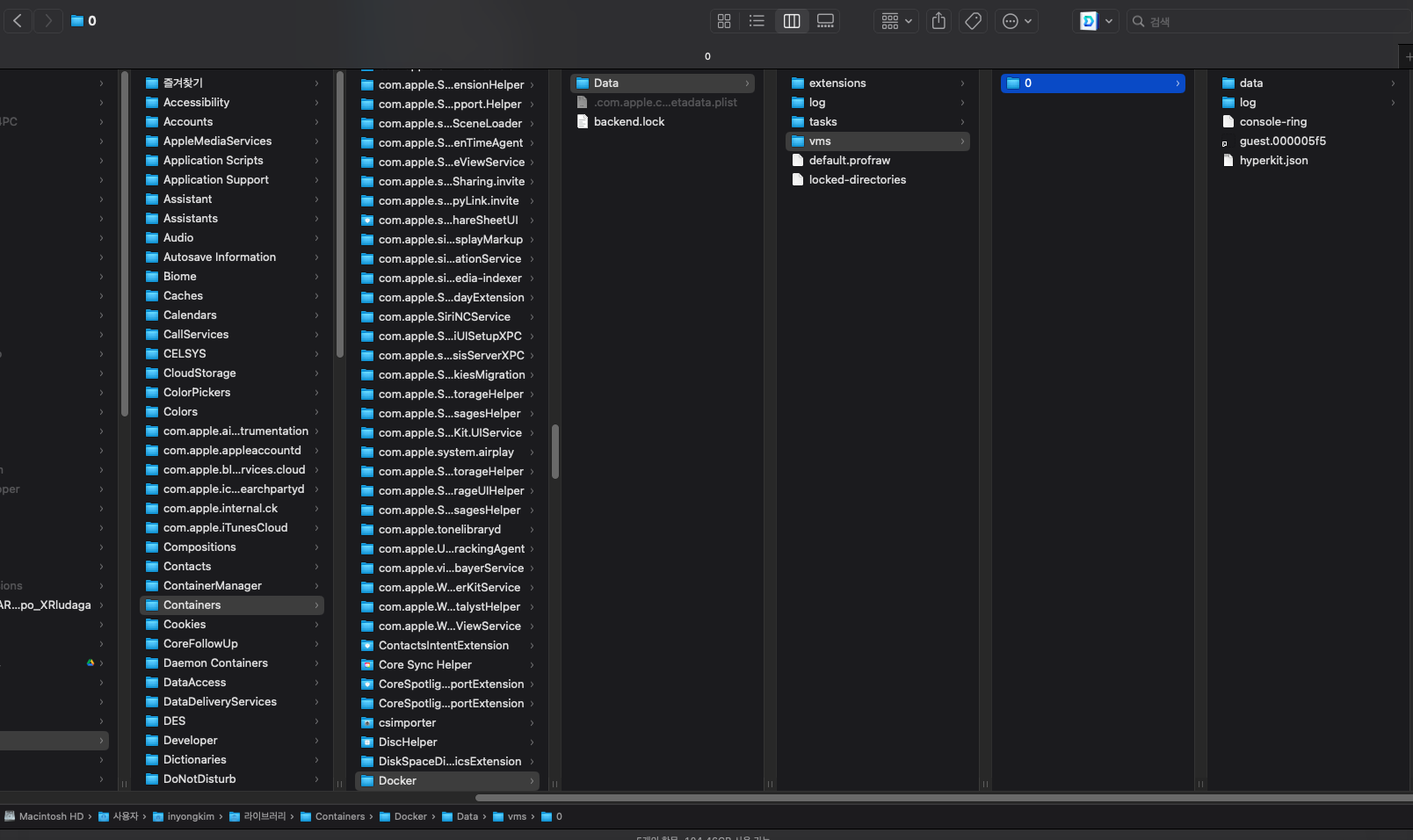 따라서 ~/Library/Containers/com.docker.docker/Data/vms/0/로 이동해보았다.