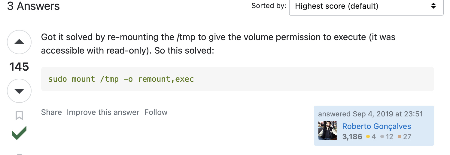 하지만 root계정 말고 $home을 접근 할 수 있는 상태(내 프로젝트 폴더를 볼 수 있는 곳)에서 docker-compose --version을 확인 할 수 없었다. stackoverflow에서 /tmp 폴더를 마운트 하라는 답변을 보았다.