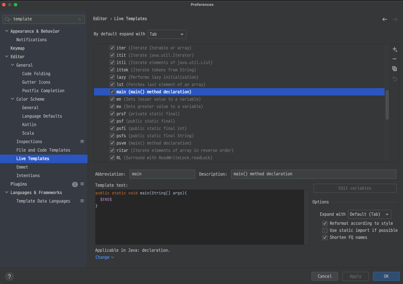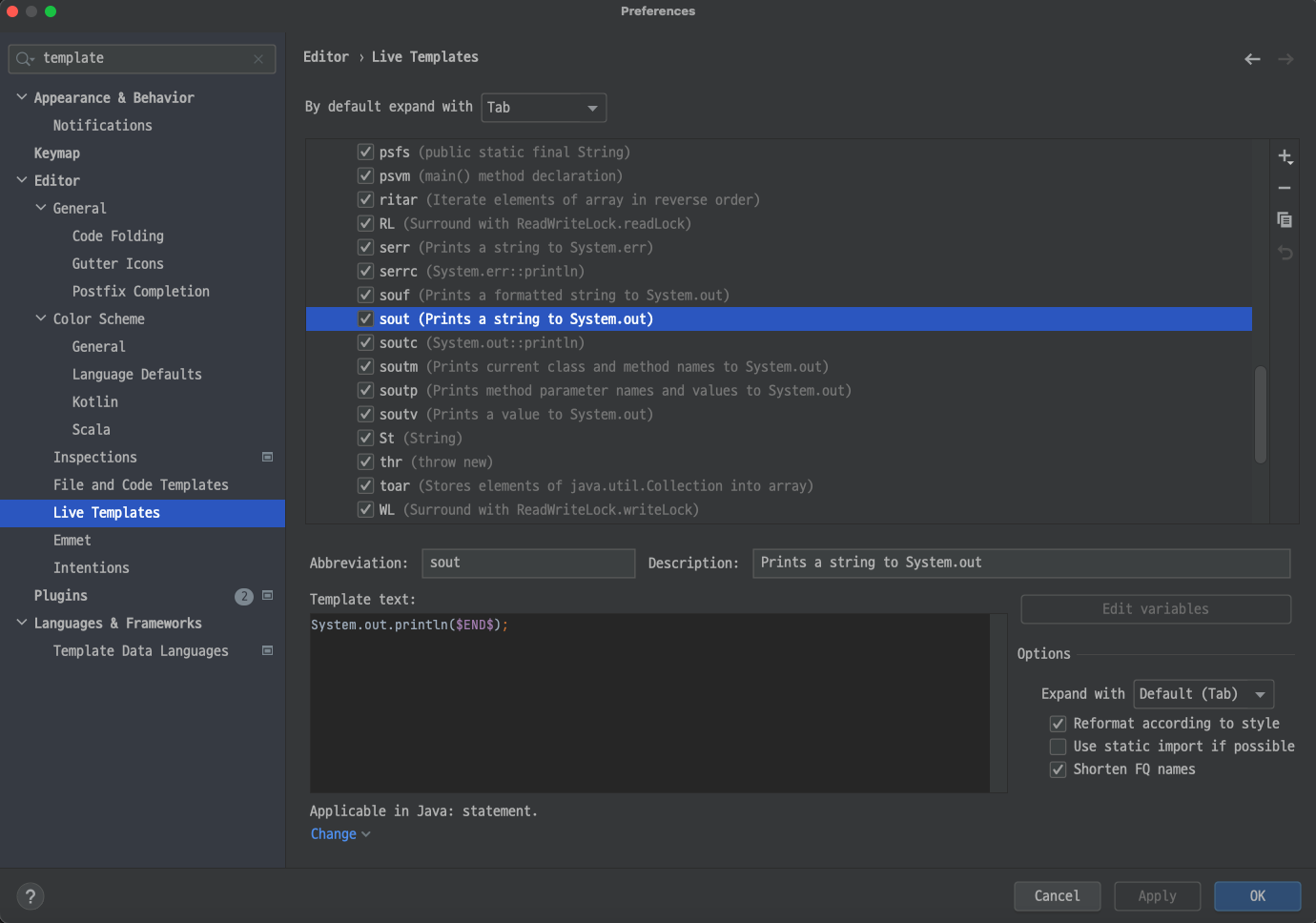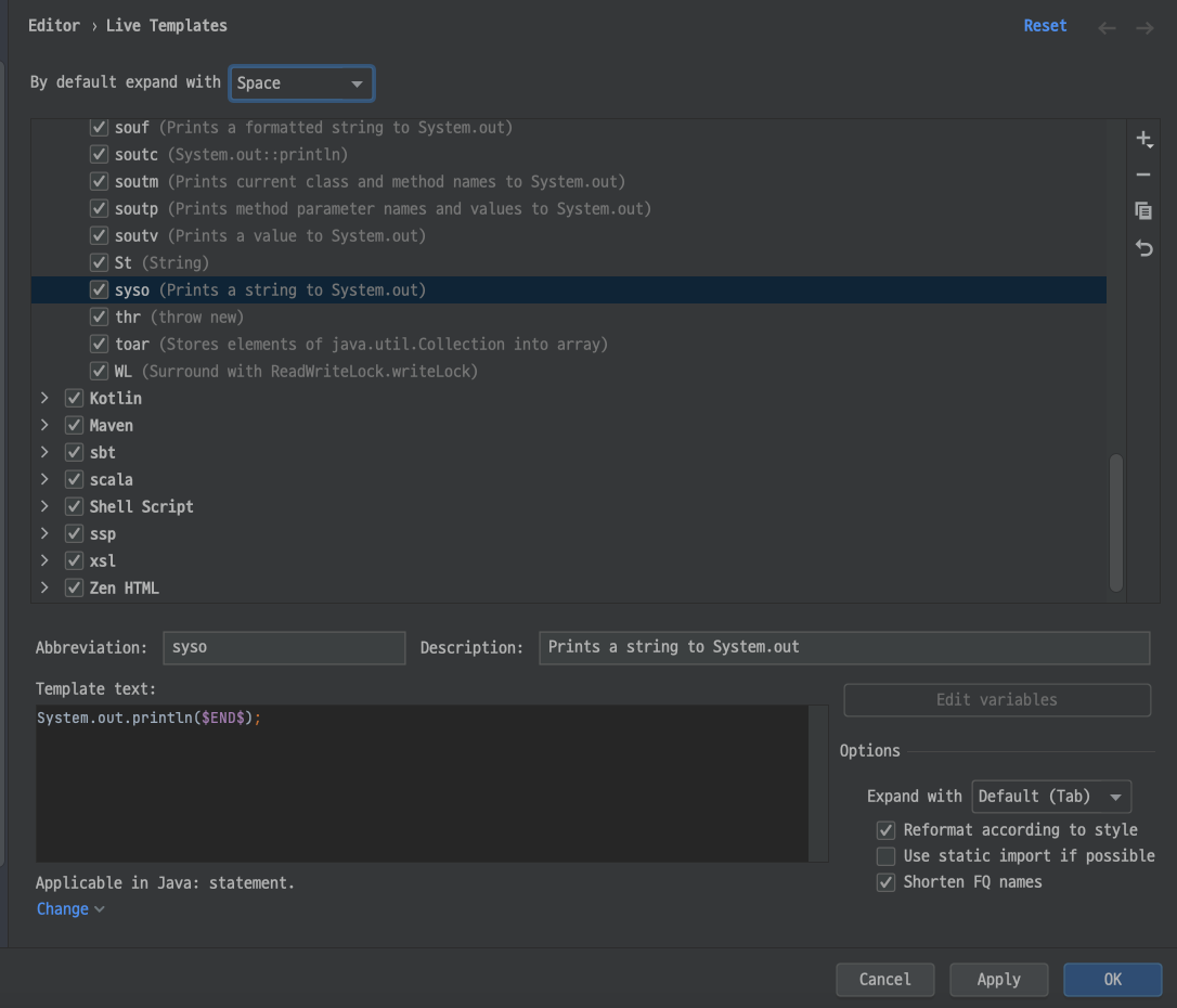 - IntelliJ에서는 구문 제안 키워드 등록을 Live Templates에서 등록한다.(Eclipse는 Preferences->Editor->Templates)
