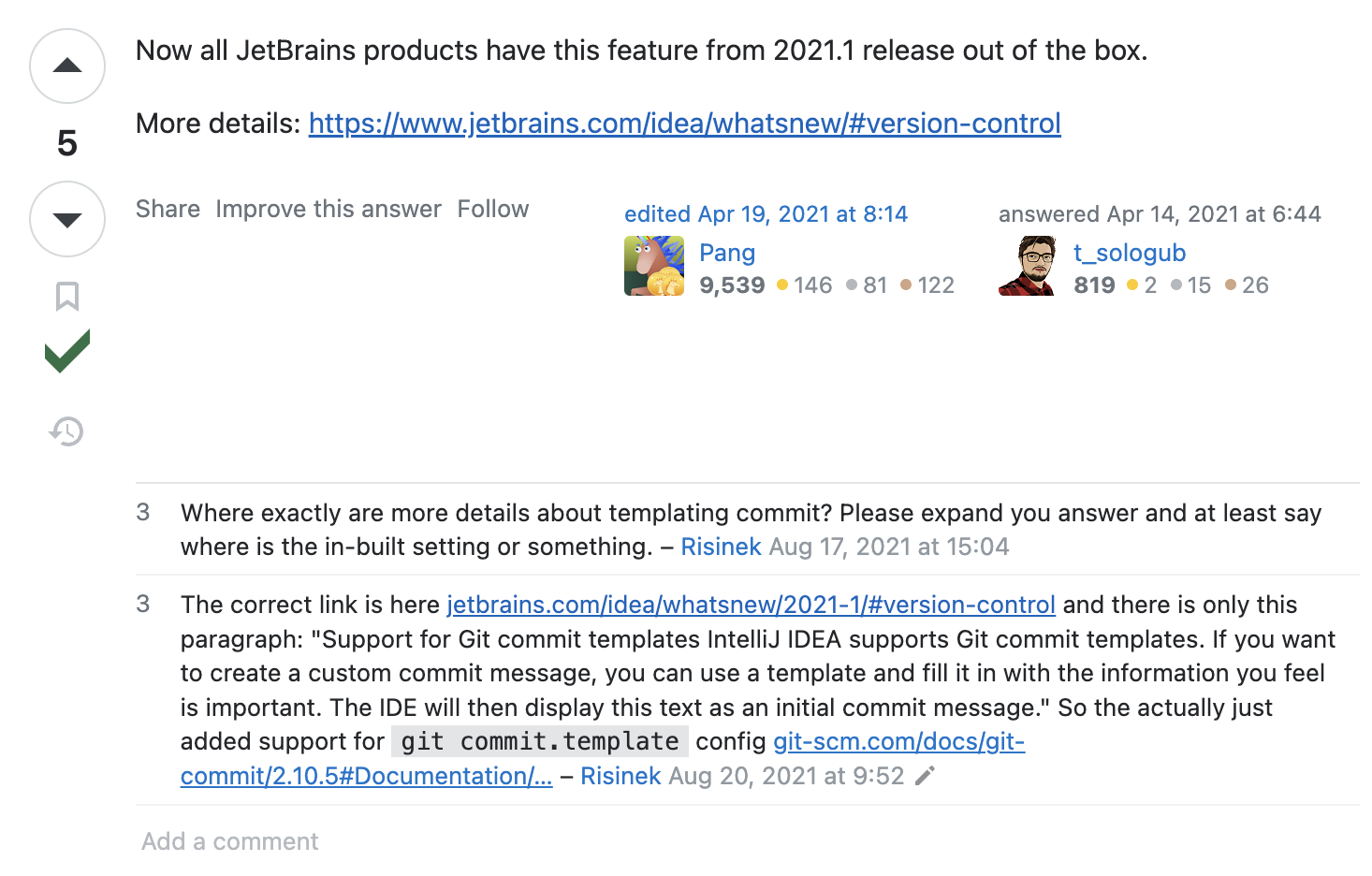 jetbrains사의 공식 IntelliJ 2021 버전 업데이트에서 Git commit templates를 지원한다는 업데이트가 있었다고 답변이 있었다. 그럼 애초에 template 기능을 가지고 있나? 공식 릴리즈 뉴스를 참고하고 직접 IDE의 이곳저곳을 살펴봤다. IDE내부 Git 기능에서 Commit을 위한 GUI로 들어가 보면 내가 git config로 설정한 template이 준비돼있는 모습을 볼 수 있다. 이 상태도 충분하지만 template을 수정한다면 경로를 config로 전달하는 GUI는 찾아보기 어려웠다. 조금 다른 것은 없을까?