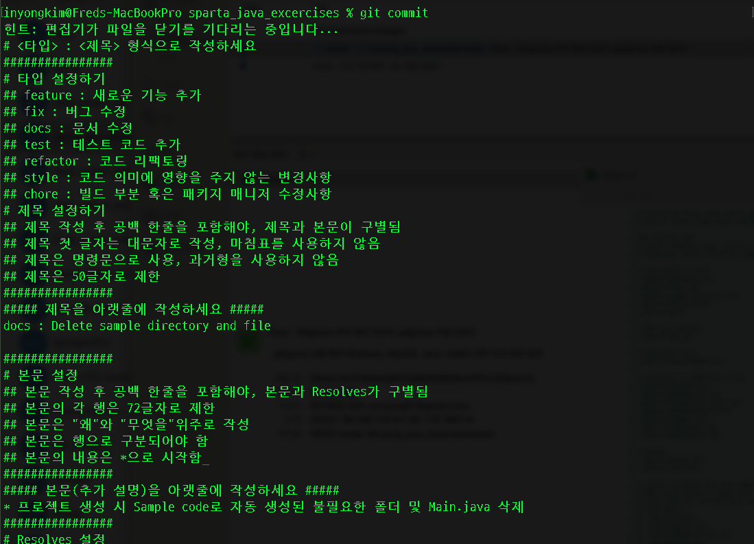 원하는 대로 Commit message가 지정된 양식에 따라 맞춰져서 입력된다.