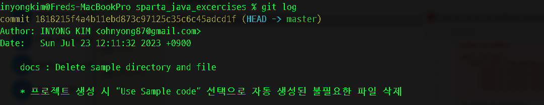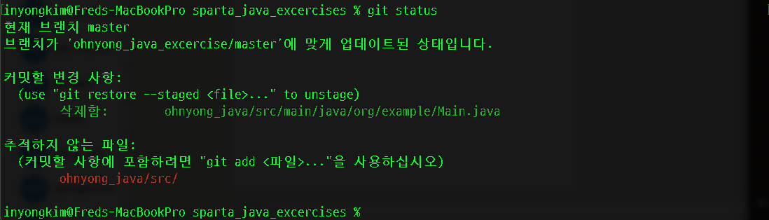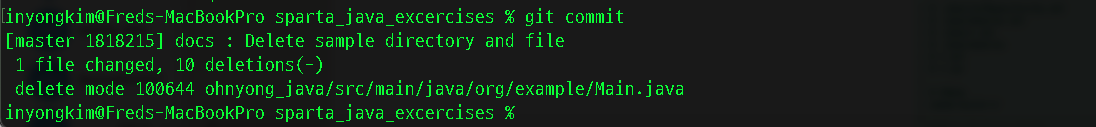 그중 java/org/example/Main.java라는 샘플 코드가 불필요하게 생성되어 있어서 삭제하는 변동 작업을 우선 스테이지에 올렸다. 해당 삭제한 변동 사항을 커밋할 때 위에서 설정한 template이 작동하는지 테스트하고자 한다.