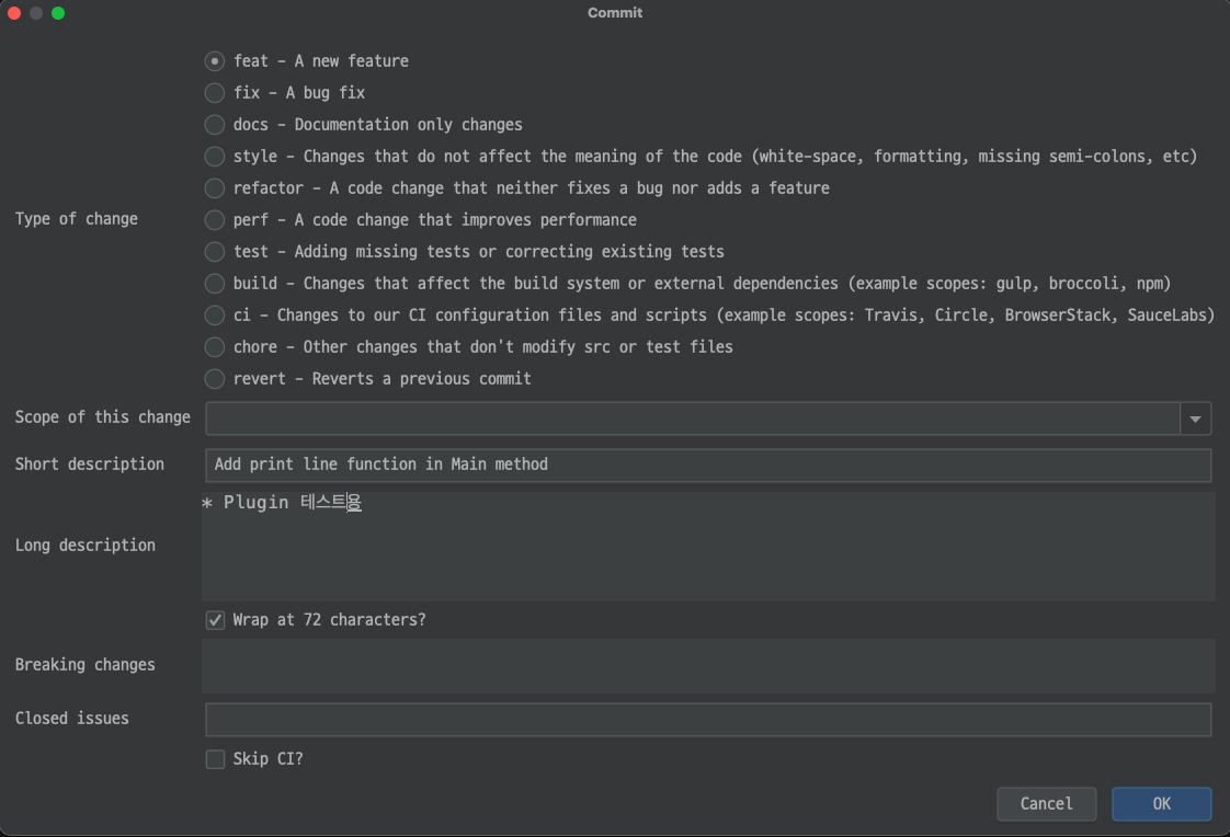 Plugin 사용 방식은 등장하는 폼이 Commit message 텍스트 자체를 생성시켜주는 역할만 한다. 통일화시켜주는 서포트 정도의 역할은 해줄 수 있다고 본다.