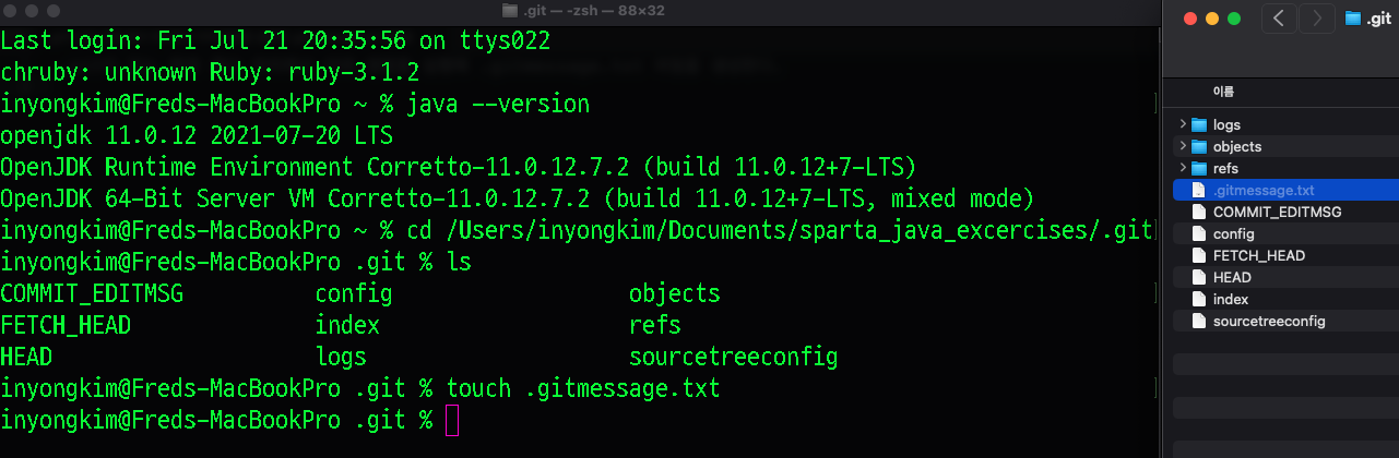 template 파일 생성하기 .git이 있는 현재 폴더 위치에서 아래 명령을 실행해 .gitmessage.txt 파일을 생성한다.
