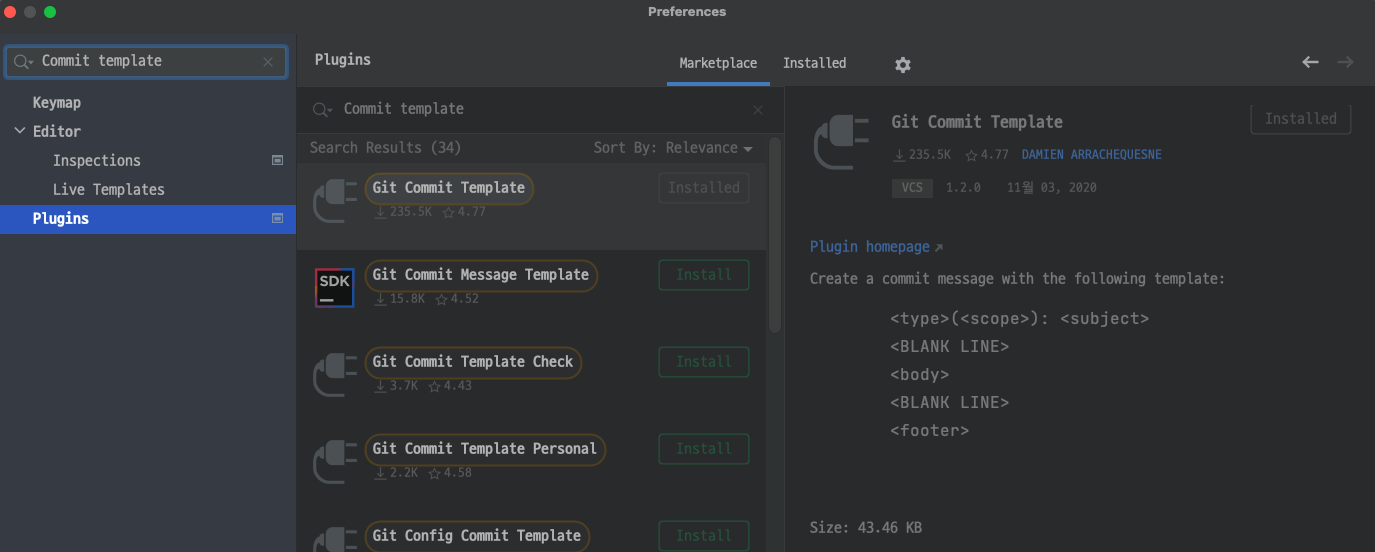 답변에서 추천한 것처럼 Git Commit Template Plugin을 다운로드하였다.