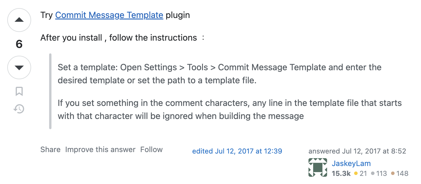 두 번째 답변은IntelliJ의 마켓플레이스에서 Git Commit Template라는 플러그인을 추천한다는 답변을 보았다.