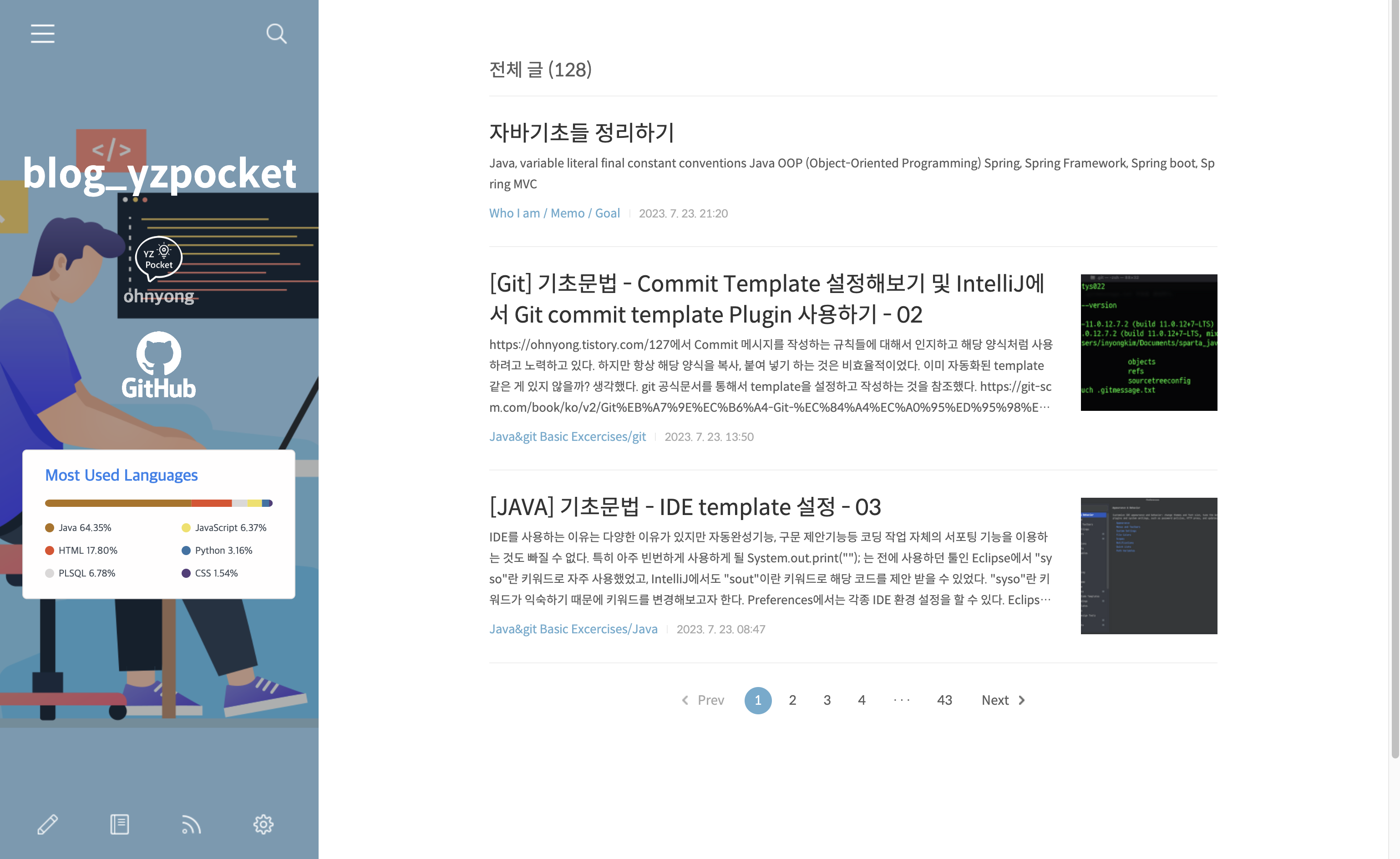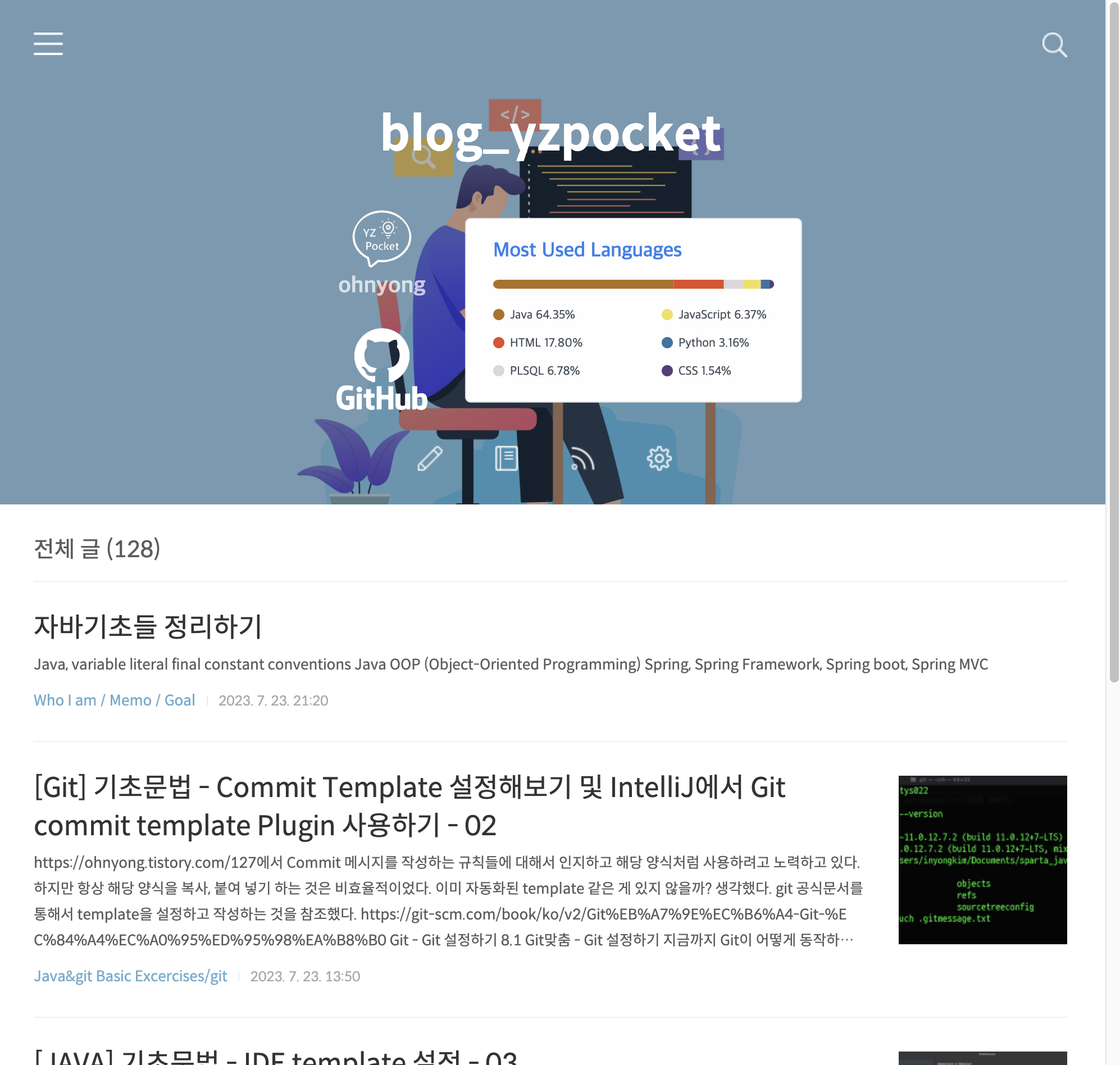 나의 티스토리 테마는 반응형으로 구현되어 있었다. 매번 백엔드에만 관심이 있었지만 프론트엔드의 반응형 웹이 변화하는 것이 항상 궁금하긴 했었다. 내가 원하는건 Most Used Languages 위젯의 크기가 커서, 반응형으로 브라우저 크기를 조절하면 메뉴가 삐져나오거나 한쪽으로 치우치고해서 꼴보기 싫었다. 아무리 티스토리 테마로 만들었다해도 HTML, CSS 수정이 가능하기 때문에 한번 수리할겸 프론트엔드는 어떤 코드를 쓰는지 살펴보았다. 우선 내가 아는 프론트엔드? 라고하기에도 기초적인 CSS 지식을 활용해서 테마 제작자의 HTML과 CSS를 살펴봤다.