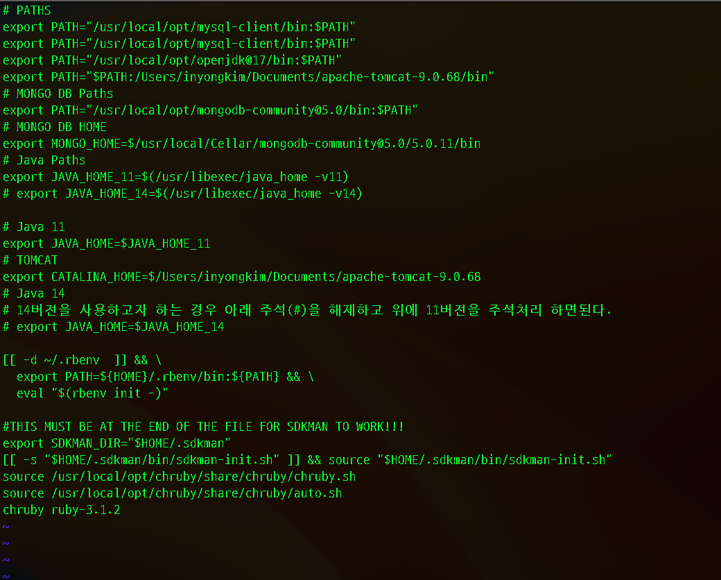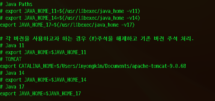 다른 버전의 JDK는 #으로 주석처리하고 JDK 17 경로를 사용한다. 변경된 설정파일을 쉘에 적용시켜야 한다.