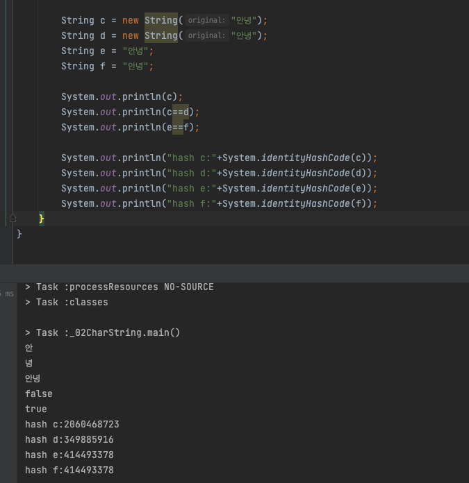 다시 정리하면 String은 배열이기 때문에 생성 할 때 위 메모리 구조가 별도로 생성되고, '안'이라는 기본자료1개, '녕'이라는 기본자료 1개 총 2개가 Stack에 저장된다. 또한, 각 메모리의 Heap에서는 각 Stack을 연결해주는 주소값이 저장된다. 그래서, c와 d는 New를 통해 새로운 객체를 생성해서 서로 다른 별개의 메모리 공간을 생성한 것이고 주소가 다를 수 밖에 없다.