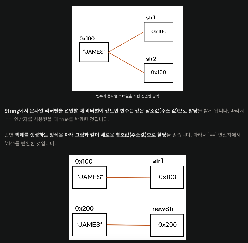 하지만 e와 f는 같이 직접 String에 리터럴(값==데이터)을 입력해서 생성하면 같은 메모리 공간에서 Stack에 1번지 2번지 처럼 2개의 데이터가 저장되어 사실 주소값이 같은 것이다. 이는 마치 건물로 생각하면 New를 통해 생성한 String 객체는 단독 주택으로 주소가 완전 다른 상태이며 String 에 값을 직접입력하여 생성한 객체는 아파트로 1동의 201호, 202호처럼 아파트 동 주소는 같은 상태라고 보면 된다. kang-james.tistory.com
