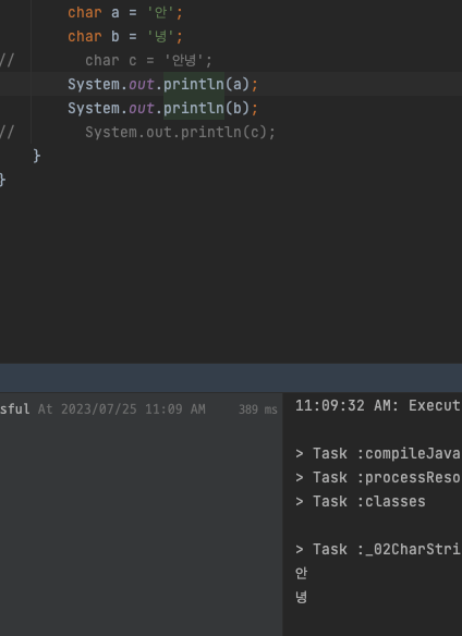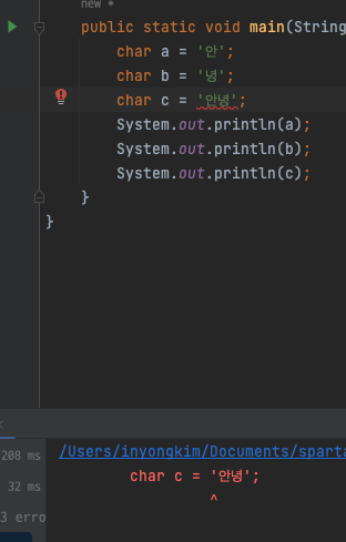문자형 들이 들어있는 배열이라 생각해야 한다. '안녕'이란 텍스트를 출력하는 방법은 '안'과'녕'을 char타입으로 a,b선언하고 a+b하는 방법이고 char타입은 '안녕'을 선언 할 수 없다. Character만 허용하기 때문이다. 그럼 '안녕'과 같은 문자열을 String으로 선언한다는 것은 문자형 2개를 가진 배열 객체를 생성하는 것이다. 그런데 조심해야 할 것이 있다. String으로 객체를 생성 할 때