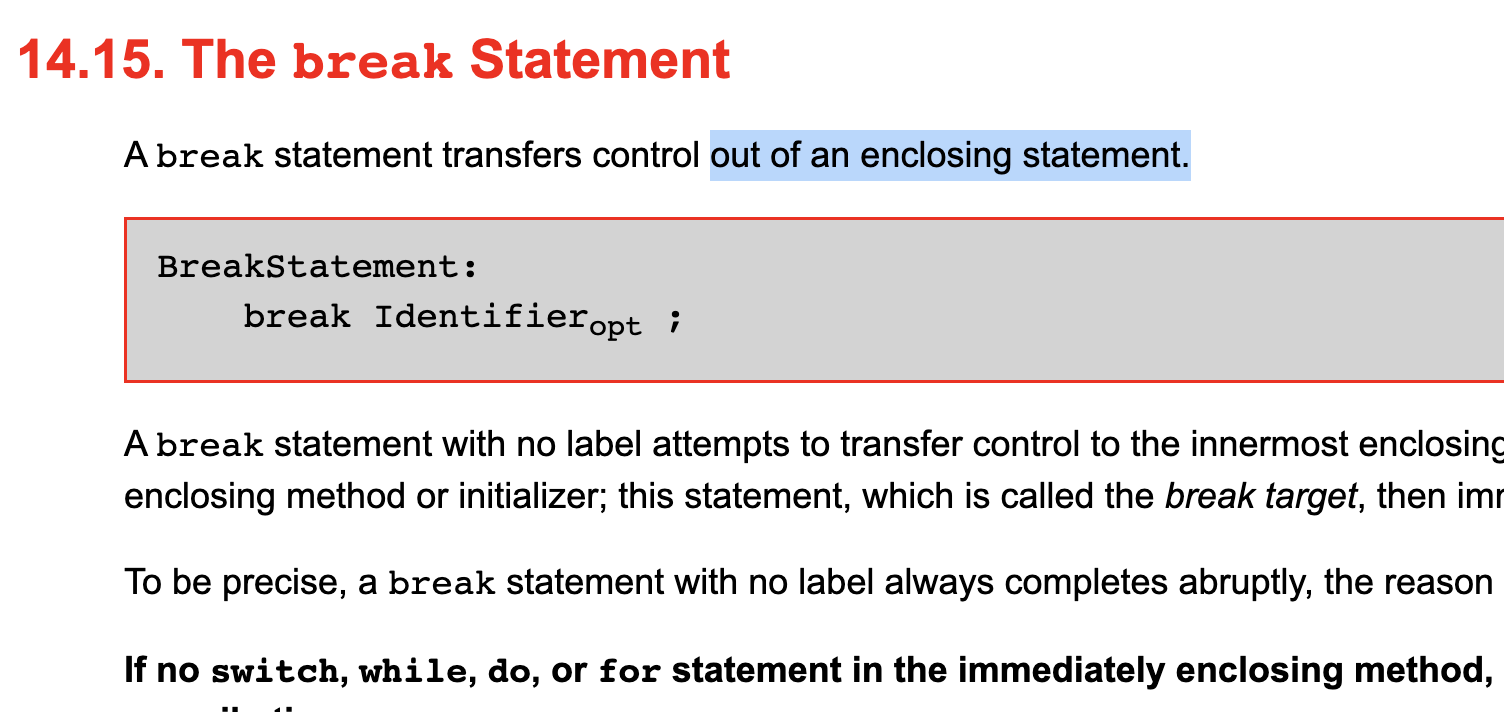 - break - 는 만나자마자 아래로 흐르지 않고 가장 가까운 블록의 for, while, switch을 중단!