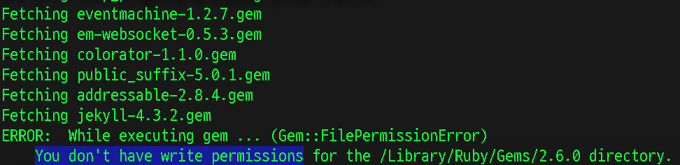 역시 오류 없이 진행될 Mac이 아니다. 시스템 ruby를 이용하고 있기 때문에 권한이 없어 gem 설치가 안되고 있다.