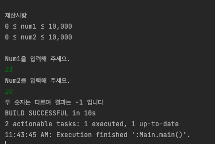 package Algorithm03; import java.util.Scanner; public class Solution { int num1; int num2; int result; Scanner sc = new Scanner(System.in); public Solution() { } // 필요 데이터 파악 // 두개의 정수 num1, num2 // 제약 조건 // 0<=num1<=10000 // 0<=num2<=10000 // 정수는 파라미터가 될 것입니다. //inputNum(){} //스캐너 필요 void inputNum() { while (true) { int num1; System.out.println("Num1을 입력해 주세요."); num1 = sc.nextInt(); if (0 >= num1 || num1 >= 10000) { System.out.println("값을 0<=num1<=10000 범위로 넣어주세요."); continue; } this.num1 = num1; break; } while (true) { int num2; System.out.println("Num2를 입력해 주세요."); num2 = sc.nextInt(); if (0 >= num2 || num2 >= 10000) { System.out.println("값을 0<=num2<=10000 범위로 넣어주세요."); continue; } this.num2 = num2; break; } receive(num1, num2); } // 받는 메서드 receive(int num1, num2){} //조건문으로 아래 컨트롤if(){}else if // 비교 연산 같으면(==) 1이란 숫자 return, // 비교 연산 다르면(!=) -1이란 숫자 return void receive(int num1, int num2) { if (num1 == num2) { result = 1; outputResult(result); } else if (num1 != num2) { result = -1; outputResult(result); } else { System.out.println("잘못된 접근입니다."); } } //outputResult(){} void outputResult(int result) { if (result == 1) { System.out.printf("두 숫자는 같으며 결과는 %d 입니다", result); } else if (result == -1) { System.out.printf("두 숫자는 다르며 결과는 %d 입니다", result); } } }