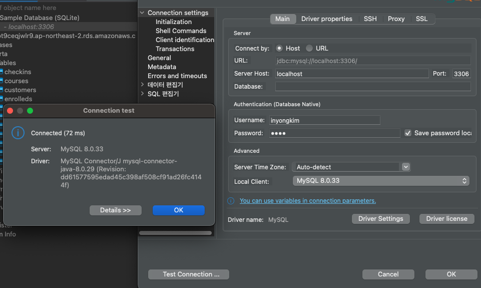 이제 아까 접속 안되던 내 Mac 계정으로 db에 접근 할 수 있게 되었다.