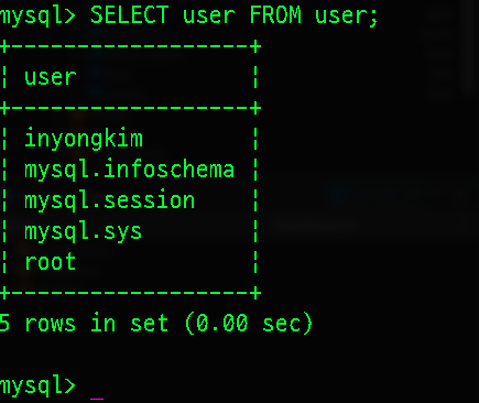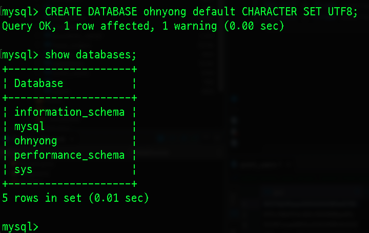 커맨드 라인이 mysql> 로 변한 것을 확인 할 수 있다. 서버내 db로 들어온 것이다. 실질적으로 table을 만들 수도 있고, 각종 sql명령문을 직접 써도 된다. 쿼리문을 gui에디터에 쓰고 실행하는 것과 동일한 행동일 뿐이다. 일단 내 이름의 계정을 만들고 모든 권한을 주려고 한다. 우선 마치 작업 폴더와 같은 DATABASE를 만들어줘야 한다.