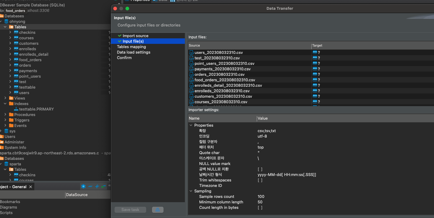우선 예제 테이블들을 내가 직접 만들 수 없으니 아마존 서버를 사용하는 강의 테이블을 csv로 추출하여 내 로컬 db에 임포트했다.