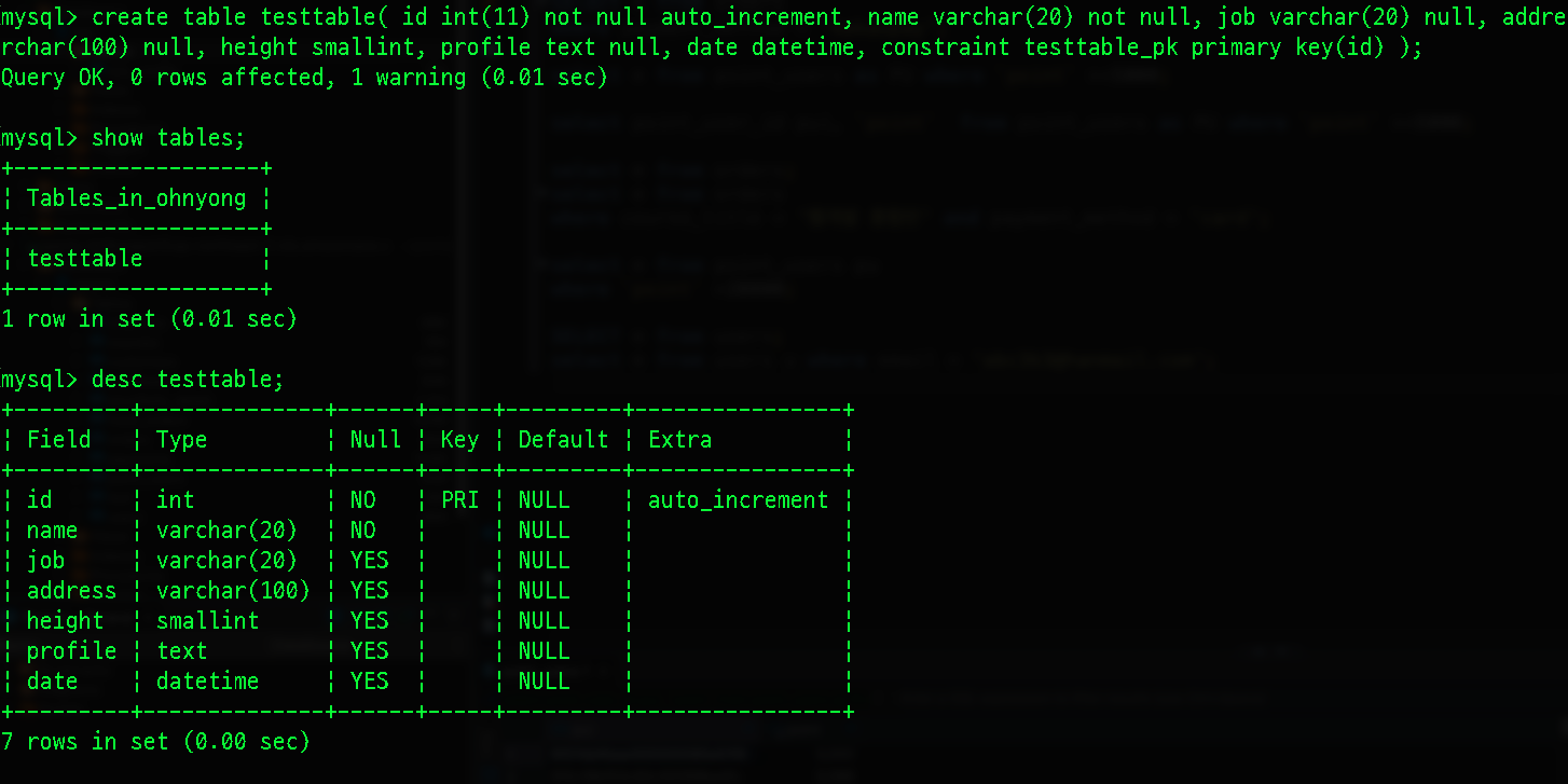 순서대로 create 명령어를 통해 테이블 명칭을 지정할 수 있고 아래 내용은 컬럼명, 데이터 타입(크기), null 가능 여부, 기타이다. auto_increment는 Oracle의 sequence와 유사한 기능이다. 맨 아랫줄은 제약조건으로 id를 pk로 지정했다.