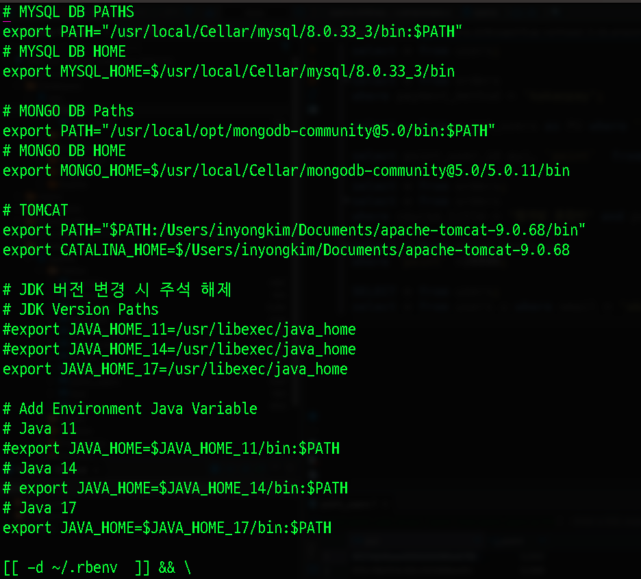 난 모든 개발버전을 주석으로 관리하고 있다. 맨윗줄처럼 Path와 Home을 Homebrew로 MySQL이 설치된 경로를 찾아 입력해주면 된다. VI에디터 말고도 그냥 숨겨진 파일을 찾아서 아무 에디터로 열고 저장해도 된다. 그게더귀찮아서 VI로 그냥 들어가서 했다.