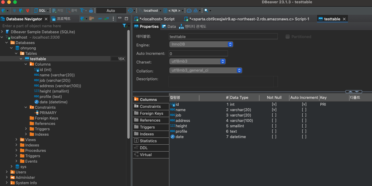 아래 처럼 내가 CLI로 생성한 테이블이 이미 자리잡고 있다. 결론은 동일하다는 것이다. CLI로 하던 GUI로 하던,, 근대 사람인데 편리한 도구가 있는데 GUI를 안 쓸 이유는 없지. 그런데 핵심은 CLI로도 익숙해지긴 해야하고 이 두개가 동일하다는 것을 아는 것이 중요하다 생각한다. 생각보다 이 개념을 모르는 사람이 많다. 독립된 프로그램인줄 알고 있다. 내가 만들 프로젝트가 100% 무조건 윈도우즈나 Mac 환경 일뿐것이라는 착각 하지 말자.