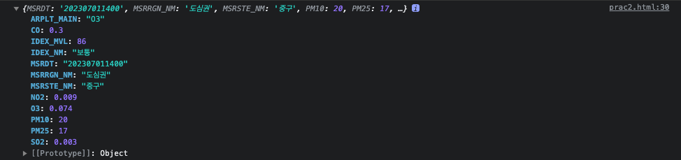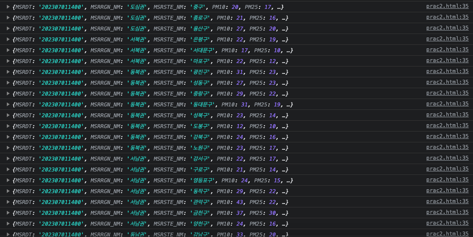 fetch("http://openapi.seoul.go.kr:8088/6d4d776b466c656533356a4b4b5872/json/RealtimeCityAir/1/99").then(res => res.json()).then(data => {