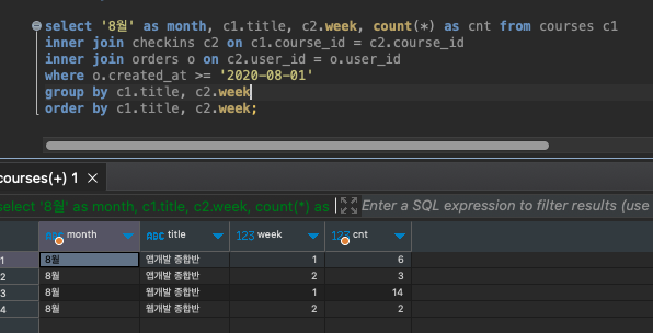 select '8월' as month, c1.title, c2.week, count(*) as cnt from courses c1