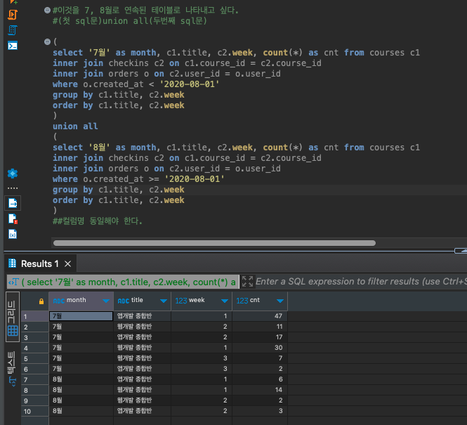 간단하게 (첫번쨰 구문) union all(두번째 구문)으로 진행 할 수 있다. 아래 구문을 실행해보면 7월 다음 8월 테이블이 그대로 들어가게 된다.