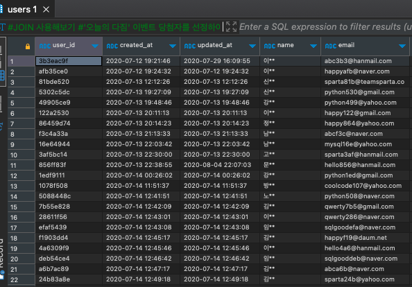 users 테이블 뒤에 checkins 테이블이 합쳐져서 나타나는 것을 확인 할 수 있다.