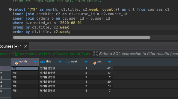 select '7월' as month, c1.title, c2.week, count(*) as cnt from courses c1