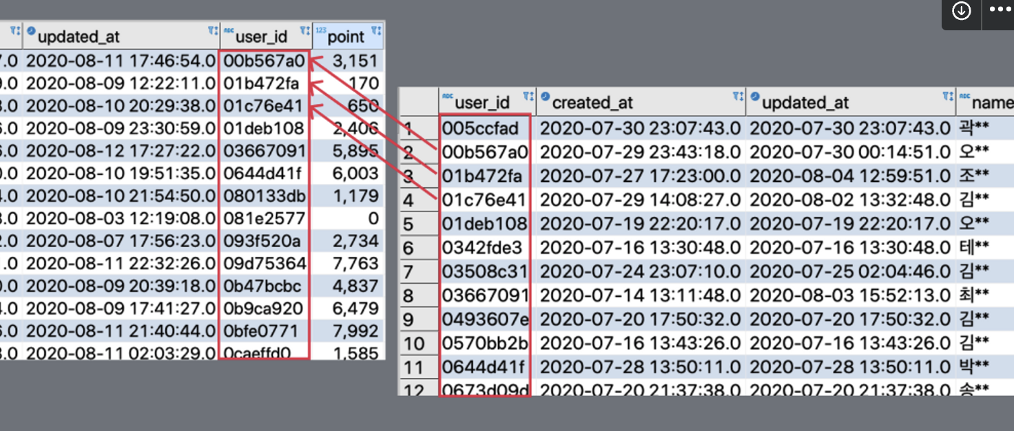 #두개의 테이블이 합쳐져야 한다. user_id란 부분이 공통부분이 있다.