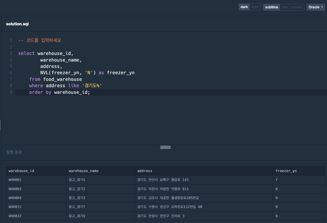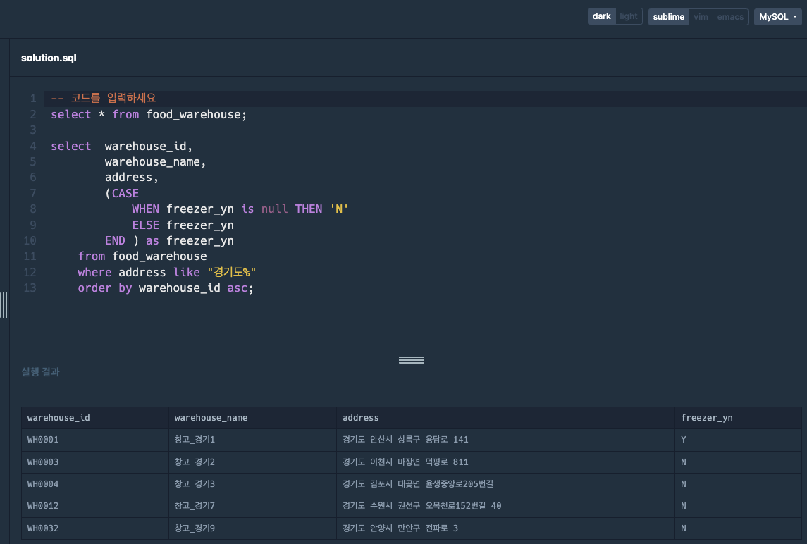 -- 코드를 입력하세요 select * from food_warehouse; select warehouse_id, warehouse_name, address, (CASE WHEN freezer_yn is null THEN 'N' ELSE freezer_yn END ) as freezer_yn from food_warehouse where address like "경기도%" order by warehouse_id asc;freezer_yz이 NULL인 경우에 'N'을 입력,