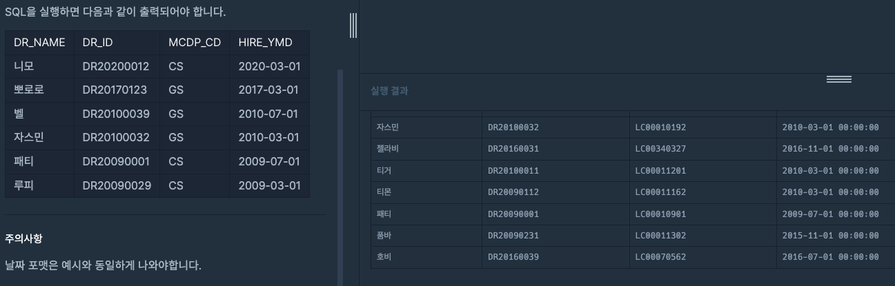 -- 코드를 입력하세요 select * from doctor; #이름아이디과고용날짜 select dr_name, dr_id, mcdp_cd, hire_ymd from doctor; #MCDP_CD가 CS 거나 GS인 (조건) select dr_name, dr_id, mcdp_cd, DATE_FORMAT(HIRE_YMD, '%Y-%m-%d') AS HIRE_YMD from doctor where mcdp_cd = "cs" or mcdp_cd = "gs" #고용일기준내림 d, 같으면 name 내림 order by hire_ymd desc, dr_name asc;