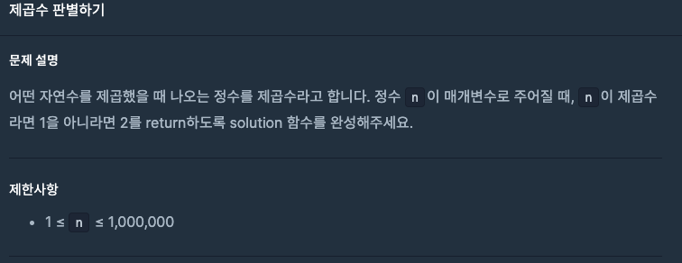 class Solution { static double rowN; static int resultN; int answer; public int solution(int n) { if(n<1 || n>1000000){ System.out.println("잘못된 숫자 입력"); }else{ rowN = Math.sqrt(n); resultN = (int)rowN; if(rowN == resultN){ answer = 1; }else{ answer = 2; } } return answer; } }검색해보니 진짜 문제풀이만을 위한 아래같은 코드도 있었다. 그런데 제한사항 같은 유효성체크는 안하는건가?? 그냥 답만 빠르게 내면 되는 것인가 혼란스럽다. 뭔가 프로그램같지 않고 암기식 공부처럼 흘러가는데 어디에 기준을 두어야 될지 모르겠다..