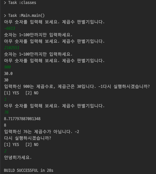 연산은 약간 고등학교 수학정도로 생각해야 했다. 근대 오래되서 기억이 잘 나질 않는다. 루트는 많이 들어봤지만 제곱수라고 명칭이 있었는지는 기억이 안났다. 아무튼 제곱근을 구하는 것이기 때문에 분명 Math클래스에서 기능이 있을 것이라 생각해서 뒤져보았는데 Math.root가 없는것이다. 그런데 잘 보니 sqrt라고 줄임말로 써져있는 것 같았다. 4로 테스트를 해보니까 역시 제곱근을 구하는 메서드가 맞아서 사용하게 되었다. 유효성체크를 모두 걸어주고 테스트를 진행했다.