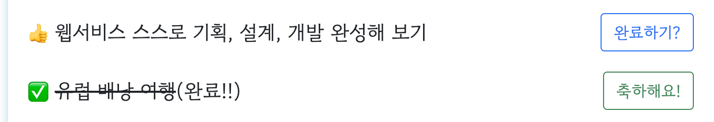완료된 상태인 경우 del 스타일과 완료메시지, 버튼 또한 축하해요라는 버튼으로 구분되도록 구성했다.