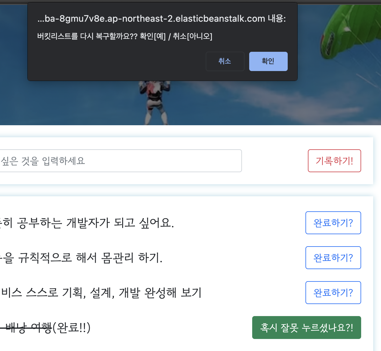 if (!confirm("버킷리스트를 다시 복구할까요?? 확인[예] / 취소[아니오]")) {